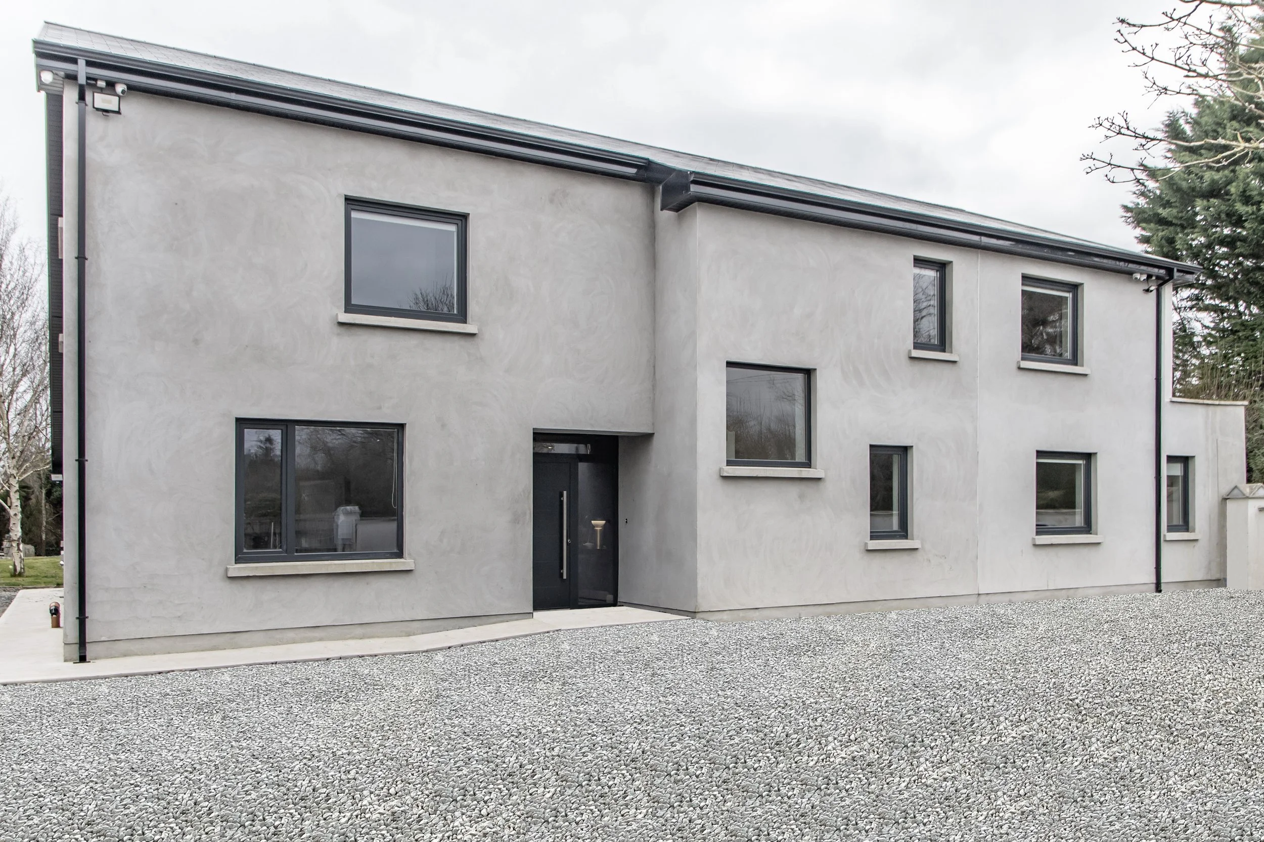 Externally the building has the form and materiality of a typical Irish house, rectangular in plan with a slate pitched roof, gable end walls and concrete render. It is its square, irregular shaped windows that give it its contemporary Swiss look. Each window has been carefully positioned to optimize light and views in each room while still maintaining a balanced facade.